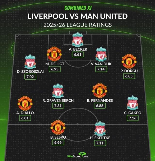 10月19日讯 本轮英超将上演曼联与利物浦的焦点对决,数据网站Whoscored也盘点了两队球员本赛季英超场均评分最高阵容,具体如下: