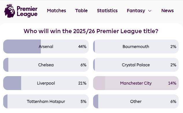 谁能夺冠?英超官网球迷投票:枪手44%第一,红军21%曼城14%