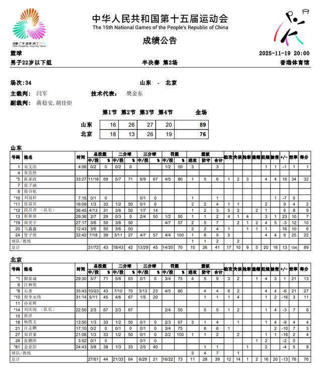 北京时间11月19日,2025年第十五届全运会U22男篮最后一场半决赛打响,山东U22男篮以89-76大胜北京队,顺利打进决赛,与东道主广东队会师。陈家政爆发,独砍32分6篮板,管子煜22分9篮板5助攻。巩晓彬想要夺冠,难啊。